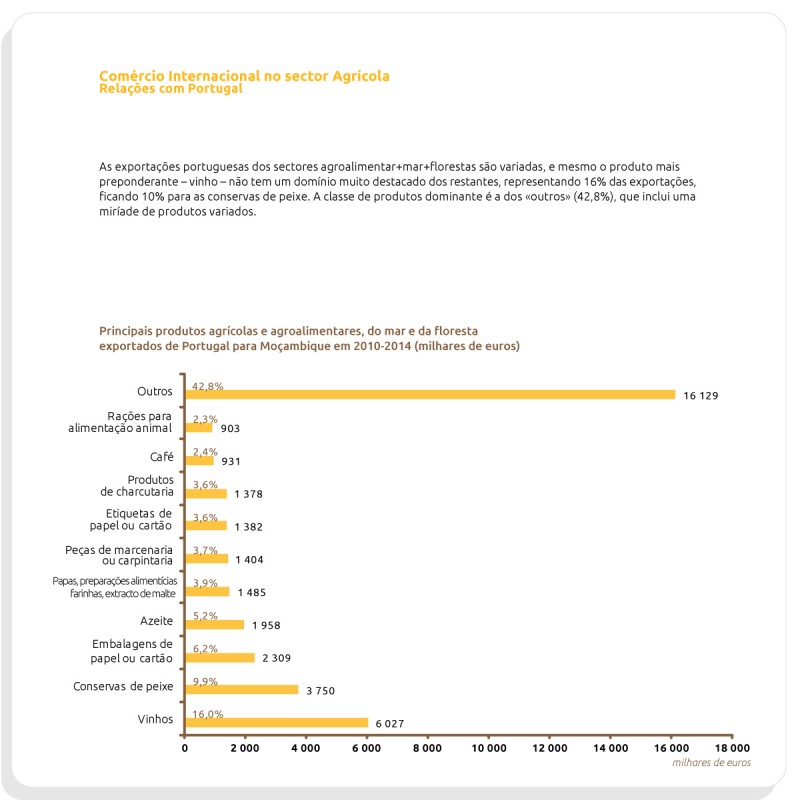 Dossier de Mercado de MoçambiqueMoçambique é um país com vastos recursos naturais, sendo a porta de entrada para a zona de comércio livre da Comunidade para o Desenvolvimento da África Austral (Southern Africa Development Community, SADC), à semelhança de Angola. Relativamente ao agronegócio, Moçambique, apresenta um enorme potencial, dado que precisa de desenvolver rapidamente a produção agrícola, hortofrutícolas, oleaginosas, cereais, bem como, a produção pecuária. A fileira agrícola moçambicana, na sua maioria, é caracterizada por uma agricultura de subsistência de pequena escala de setor familiar, necessitando de infraestruturas, redes comerciais e níveis de investimentos adequados. A indústria não possui um desenvolvimento substancial, sendo as pequenas indústrias de moagem e fabrico de óleos alimentares, as mais predominantes. A região de Moçambique, que tem maior potencial agrícola, é aquela que engloba as Províncias de Cabo Delgado e de Nampula, concentrando aproximadamente dois terços da produção nacional, devido à predominância de zonas de altitude média e um menor risco de seca. Nestas províncias, as principais culturas, são o milho, a mapira, a mandioca, o arroz (exclusivo das zonas costeiras), o algodão (nas zonas altas), assim como o amendoim, o chá e o tabaco. Nas zonas litorais predomina o caju, sendo estas, as zonas onde se verificam maiores produções. A grande dinamização atual do Corredor de Nacala que abrange a Províncias de Nampula, Niassa, Cabo Delgado, Zambézia e Tete tem potenciado favoráveis investimentos agrícolas, proporcionando-se o estabelecimento de um crescente investimento estrangeiro no setor agroalimentar. As províncias que estão sob a influência do Corredor de Nacala, beneficiam de excecionais condições agroecológicas e logísticas (linha- férrea de 912 km que cruza o Corredor de Nacala entre o interland e o Porto de Nacala). Moçambique tem efetuado variados investimentos na indústria da exploração e produção de gás. Possui reservas de gás natural suficientes para abastecer a Alemanha e a França durante 20 anos, o que tem acelerado o desenvolvimento da região. Grandes empresas têm investido em atividades de pesquisa de petróleo e gás em várias regiões, com destaque para a Bacia do Rovuma, Província de Cabo Delgado. Esta província, de que Pemba a é capital, tem permitido aos investidores e empresários enfrentarem desafios de grande vulto, tendo em conta a dimensão dos seus recursos naturais e endógenos. Com efeito, não é apenas na área do setor energético que se abrem oportunidades para as empresas portuguesas. Existem algumas áreas, que apesar de serem independentes dos projetos do setor energético, têm vindo a surgir, em resultado do desenvolvimento desta região, como é o caso de empresas de logística, catering, construção civil e maquinaria. Através deste documento A CAL – Câmara Agrícola Lusófona pretende disponibilizar diversos dados no âmbito do agronegócio local, com vista a incrementar o relacionamento estratégico entre Portugal e Moçambique.