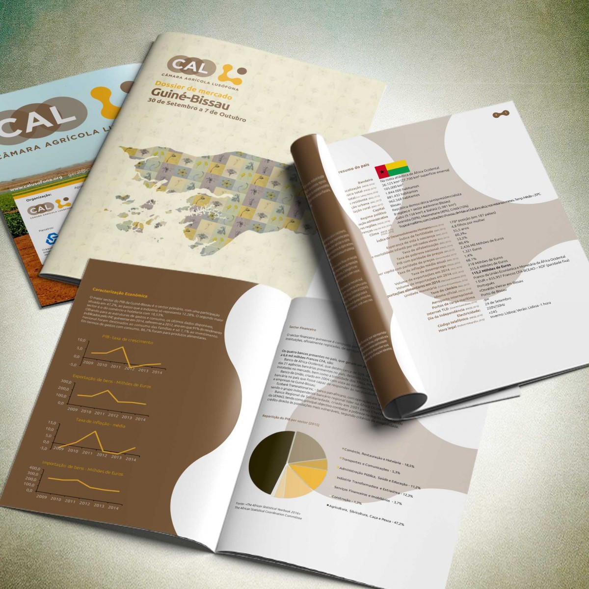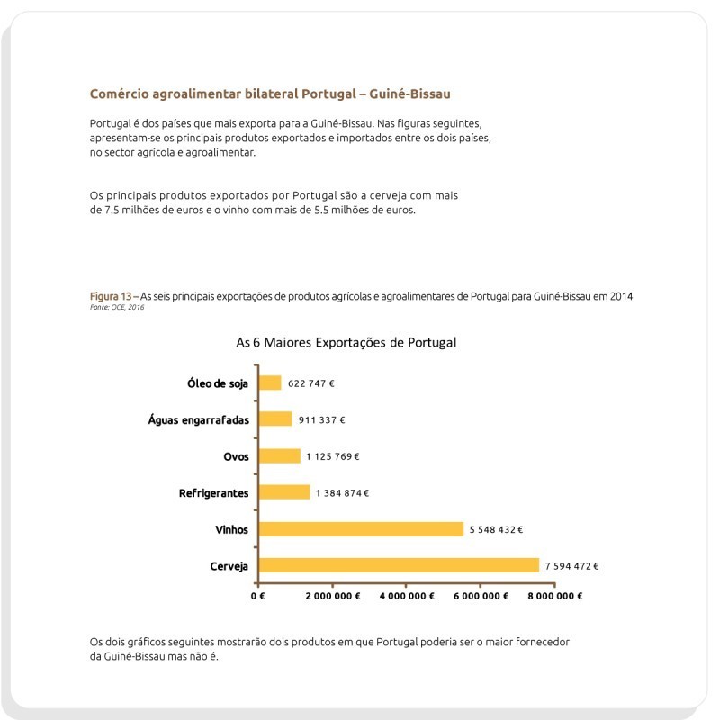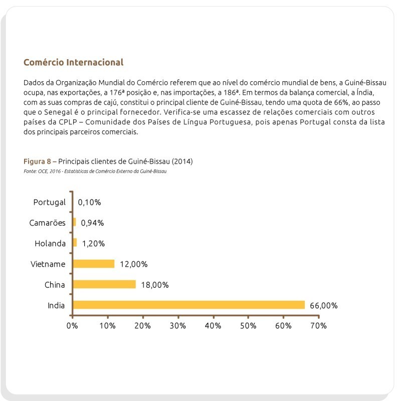 Dossier de Mercado Guiné-BissauNos últimos anos, Guiné-Bissau tem dado importantes passos para a atração do de investimento estrangeiro, constatando-se uma grande dinâmica e entusiasmo, por parte de empresários portugueses. É um país que possui um potencial económico interessante, devido à riqueza dos seus recursos naturais e à existência de alguns setores ainda inexplorados. A agricultura, a agroindústria e as pescas constituem os principais eixos de desenvolvimento do país. A economia é dominada pela produção de arroz, a base da dieta alimentar do país, e pela produção de castanha de caju, da qual é um dos cinco maiores produtores mundiais, com 195 mil toneladas, em 2015. O caju, em 2014, representou 77% do total do valor de todas as exportações da Guiné-Bissau. A incipiente indústria transformadora é, essencialmente, do setor alimentar, em particular a produção de óleos vegetais. Para as empresas que queiram exportar os seus produtos, a Guiné-Bissau é, ao contrário do que se poderia supor, um mercado com muito por explorar, apesar da sua reduzida área. A predominância da agricultura familiar e os focos no caju e no arroz, fazem com que a Guiné-Bissau necessite de importar todo o género de alimentos. Alternativamente, os empresários portugueses poderão investir na produção agrícola naquele país, quer, para servir o mercado interno, quer para exportar para a Europa, nomeadamente hortofrutícolas “fora-de-estação”. Estima-se que o potencial agrícola guineense seja de 1.100.000 ha, equivalente a 30% da superfície total do país. A topografia permite o desenvolvimento de duas zonas com altas potencialidades produtivas. Tratam-se das zonas influenciadas pelas marés e as zonas circundantes das grandes bacias dos rios Geba e Corubal. Através deste documento A CAL – Câmara Agrícola Lusófona pretende disponibilizar diversos dados no âmbito do agronegócio local, com vista a incrementar o relacionamento estratégico entre Portugal e Guiné-Bissau. Poderá encontrar neste documento